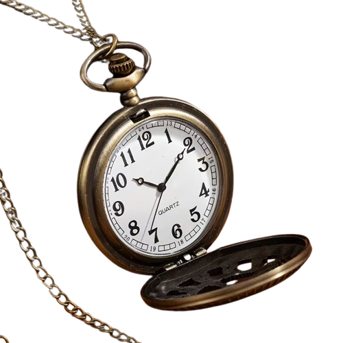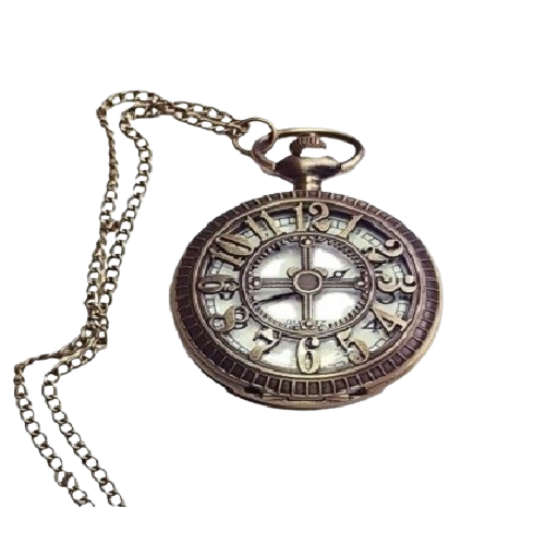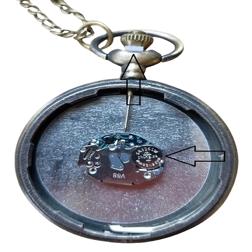 Vackert vintage fickur av bronsfärgad metall. Ytterhöljet öppnas för att se tiden. Baksidan tas bort för att byta batteri. Batterisort: SR626SW. På bilden syns var batteriet sitter. Den översta pilen visar den vita lilla plastbiten, som skall tas bort, så att klockan går igång.
