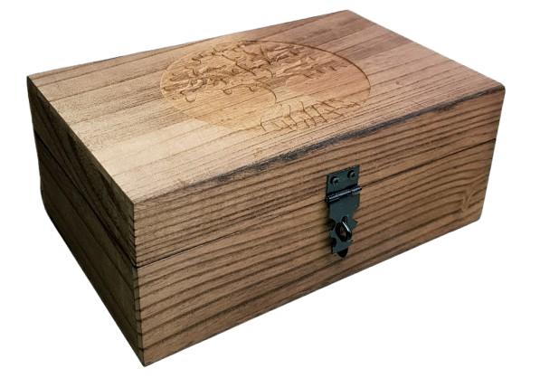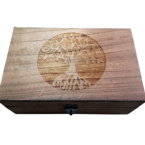 Samlarask av trä, med vackert motiv av Livets träd på locket. Den har en silkeslen yta och ljus färg. Perfekt att lägga minnessaker eller smycken i. Eller ge bort som present.