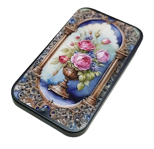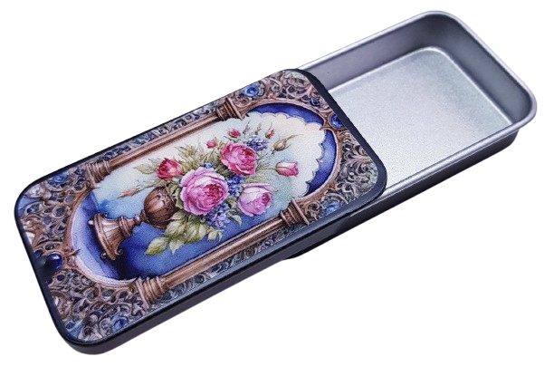 Så söt liten ask av metall med vintage mönster. Den är till för tändstickor och har ett plån på undersidan. Den öppnas genom att skjuta översidan. Tändstickor ingår inte, eftersom man inte får skicka det per post.